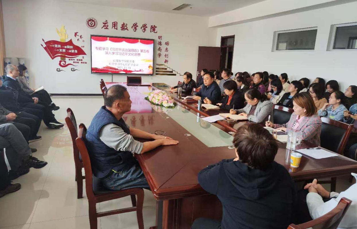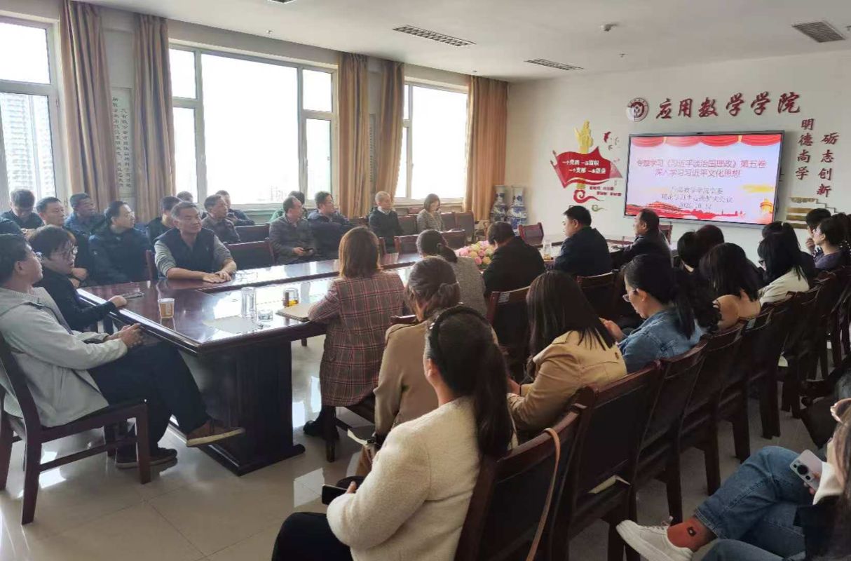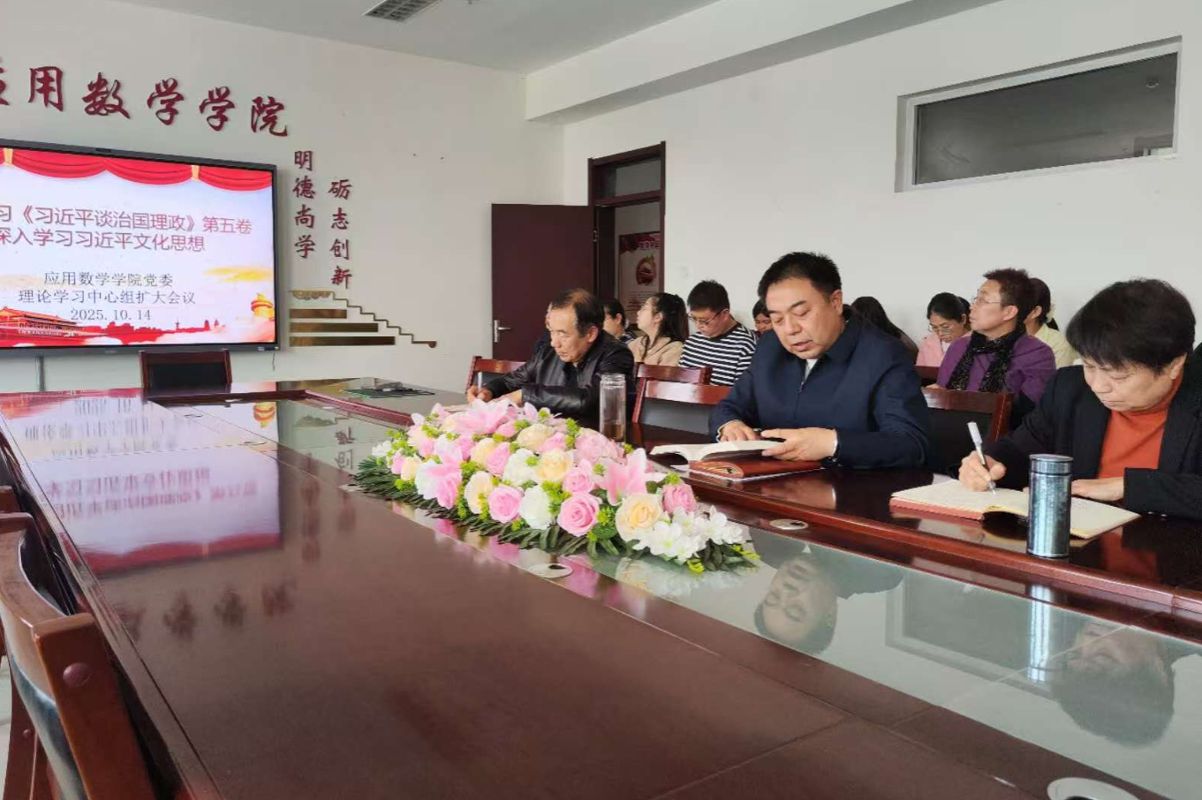 2025年10月14日下午,应用数学学院党委在学院会议室组织召开理论学习中心组(扩大)会议,专题学习《习近平谈治国理政》第五卷,重点围绕习近平文化思想进行深入学习和研讨。学院党委书记秦春主持会议,学院全体教职工参加了本次学习。