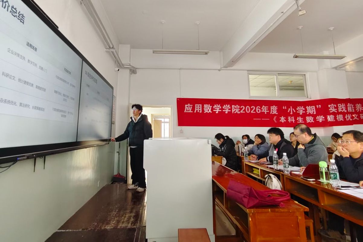 为进一步巩固本科生专业基础,增强本科生数学建模竞赛实际操作能力、学术论文撰写水平以及逻辑思辨素养,应用数学学院于2026年1月14日至17日精心策划并开展了“小学期”实践活动——《本科生数学建模优秀论文研读》。全院大二、大三60余名本科生积极参与、自由组队,经过为期四天的深入钻研与小组研讨,顺利完成此次实践任务,营造出比学赶帮超的良好氛围,取得了显著成效。